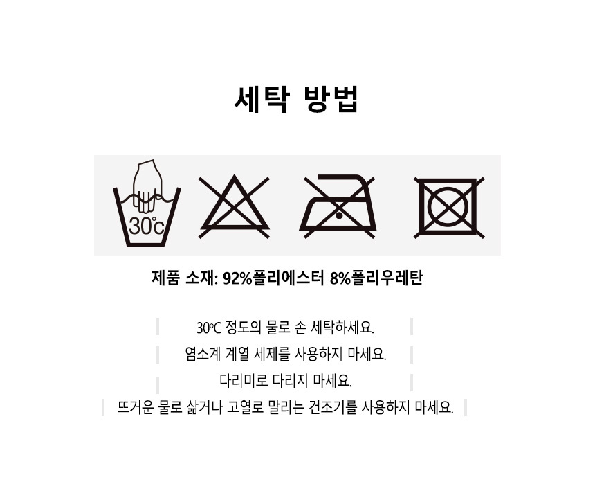 취급시 주의사항 30°C에서 세탁기 세탁 가능 / 표백 금지 / 다림질 금지 / 회전식 건조기 사용 금지.