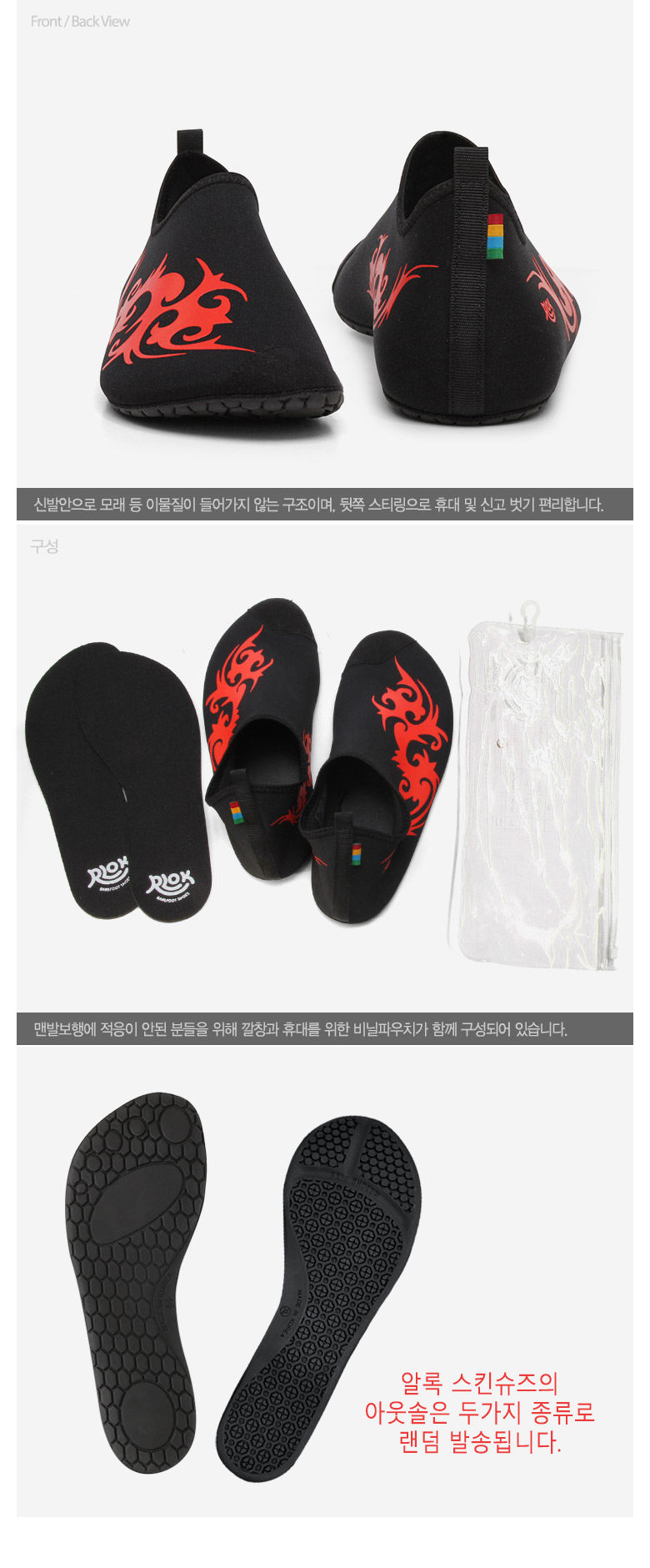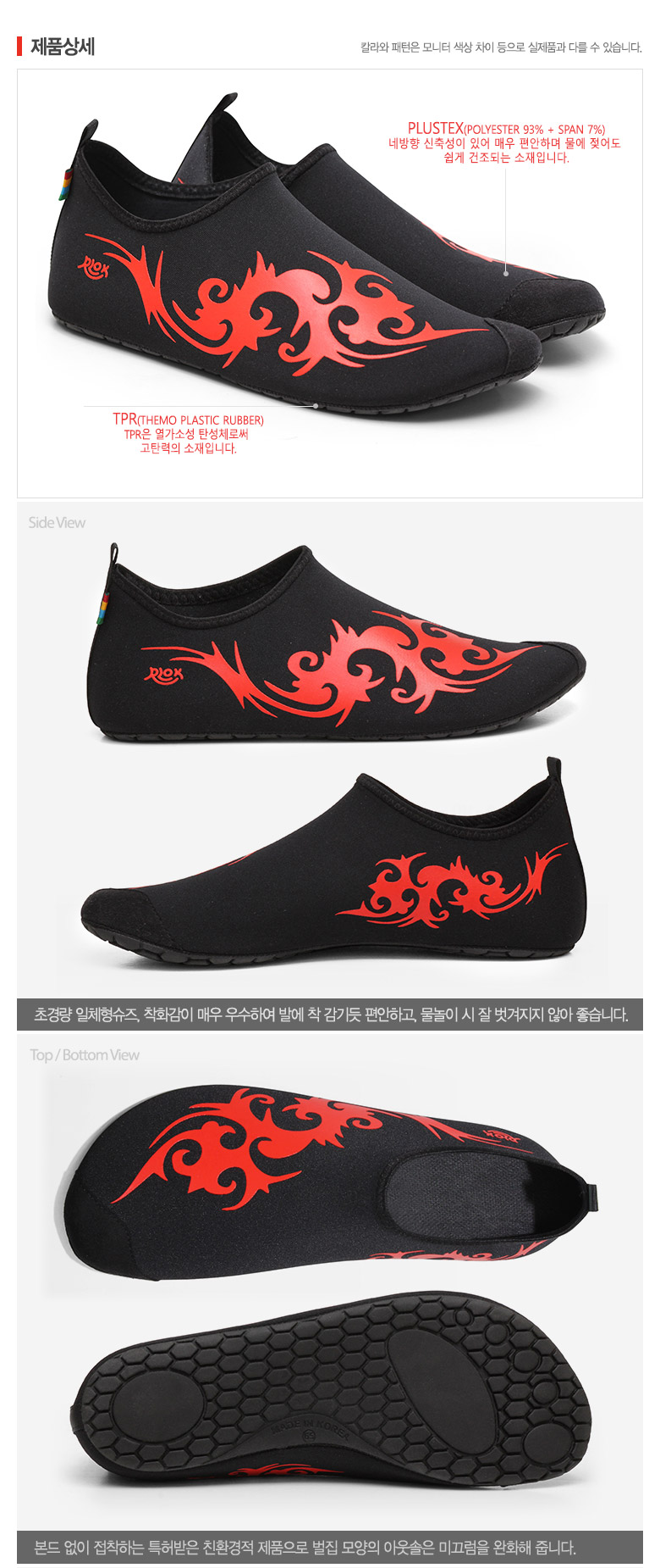 제품 소재 갑피: Polyester93%+Span7% / 아웃솔: T.P.R100% / 인솔: E.V.A100%